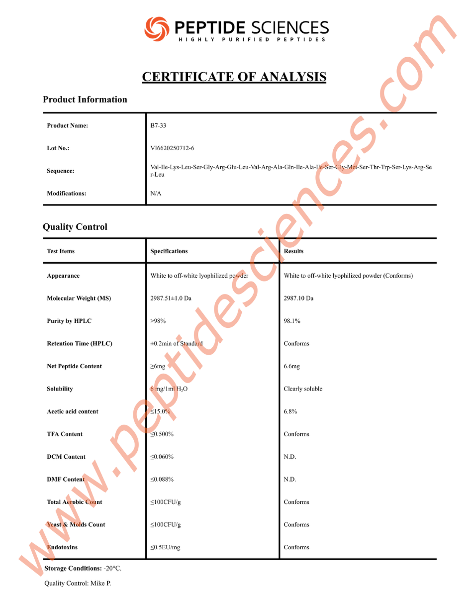 B7-33 is a first-in-class synthetic single-chain peptide categorized primarily as a potent anti-fibrotic and cardiovascular research agent. Engineered as a functional analog of the endogenous human gene-2 relaxin (H2-relaxin), B7-33 was designed specifically to overcome the solubility and manufacturing challenges of the full-length protein. At the Peptide Sciences official store, we provide B7-33 verified via HPLC-MS to ensure a 99%+ purity rating. This 6mg formulation is the definitive tool for laboratories investigating the prevention of organ scarring, tissue remodeling via MMP-2 activation, and RXFP1-mediated signaling pathways.