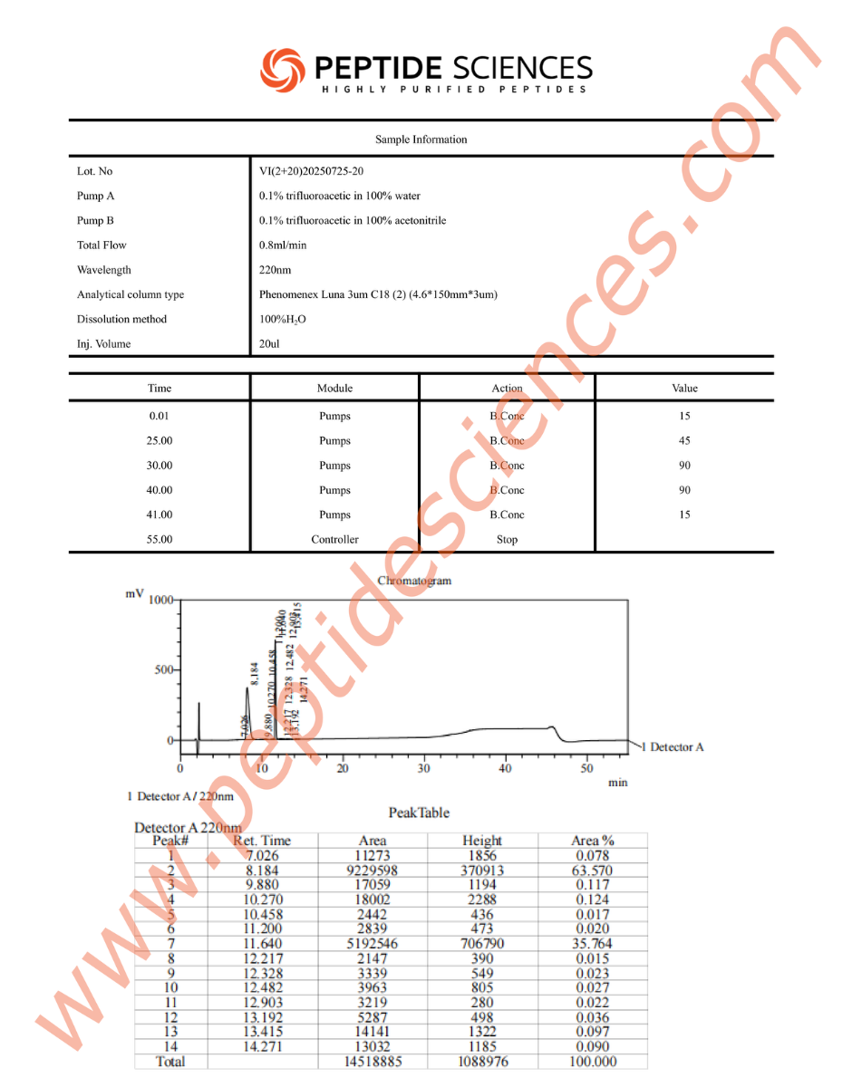 At Peptide Sciences LLC, we implement the most stringent quality control standards in the industry. From the initial synthesis to the final vacuum-sealing process, our BPC-157, TB-500 is monitored for purity and stability. Every batch is subjected to High-Performance Liquid Chromatography (HPLC) and Mass Spectrometry (MS) analysis. This ensures that when you buy BPC-157, TB-500 online, you are receiving a product with a verified sequential fingerprint, exceeding 99% purity and free from any acetate or TFA contaminants.
