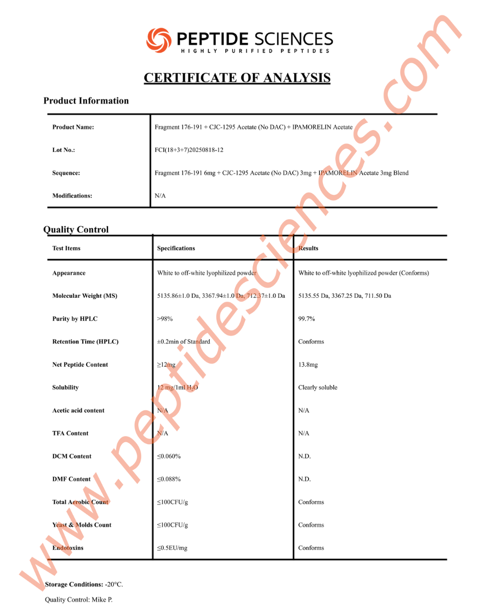 Buy Fragment, CJC-1295, Ipamorelin 12mg Online – Advanced Triple Research Blend. This 12mg blend combines three powerful research peptides: hGH Fragment 176–191, CJC-1295 (No DAC), and Ipamorelin. It is specifically designed for laboratories studying growth hormone axis modeling and metabolic synergy. At the Peptide Sciences Official Store, we provide HPLC-MS verified blends with guaranteed 99%+ purity. All orders include a COA and are shipped discreetly to protect your laboratory’s privacy.