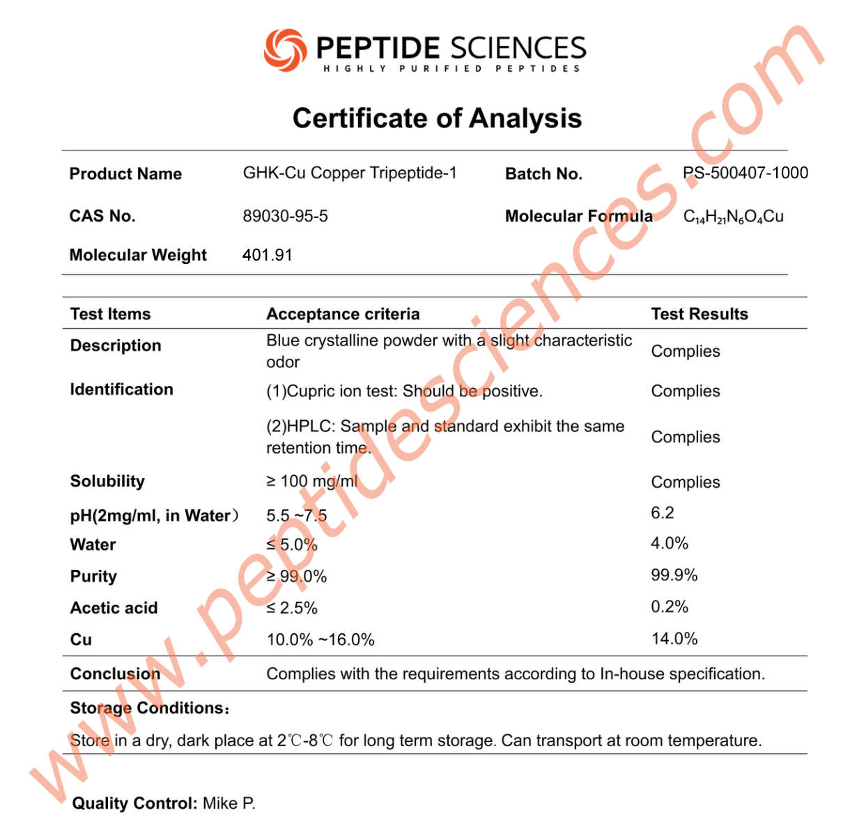 GHK-Cu (copper tripeptide) is one of the most well-examined peptides and is a naturally occurring plasma peptide that significantly declines during human aging and. In cosmetic applications, GHK-Cu is used in anti-aging, anti-wrinkle, after-sun, skin renewal, skin moisturizer, and hair growth stimulating products. The in vitro research effects of this carrier peptides is to deliver copper to the skin to activate enzymatic wound-healing pathways, while the desired, in vivo, effect is to make the skin more smooth, thick, and firm due to increased collagen production. GHK-Cu has been proven to stimulate collagen and decorin production and improving wound healing and tissue generation. It has also been established that GHK-Cu improves the condition of aging skin and hair, and possesses antioxidant and anti-inflammatory effects.