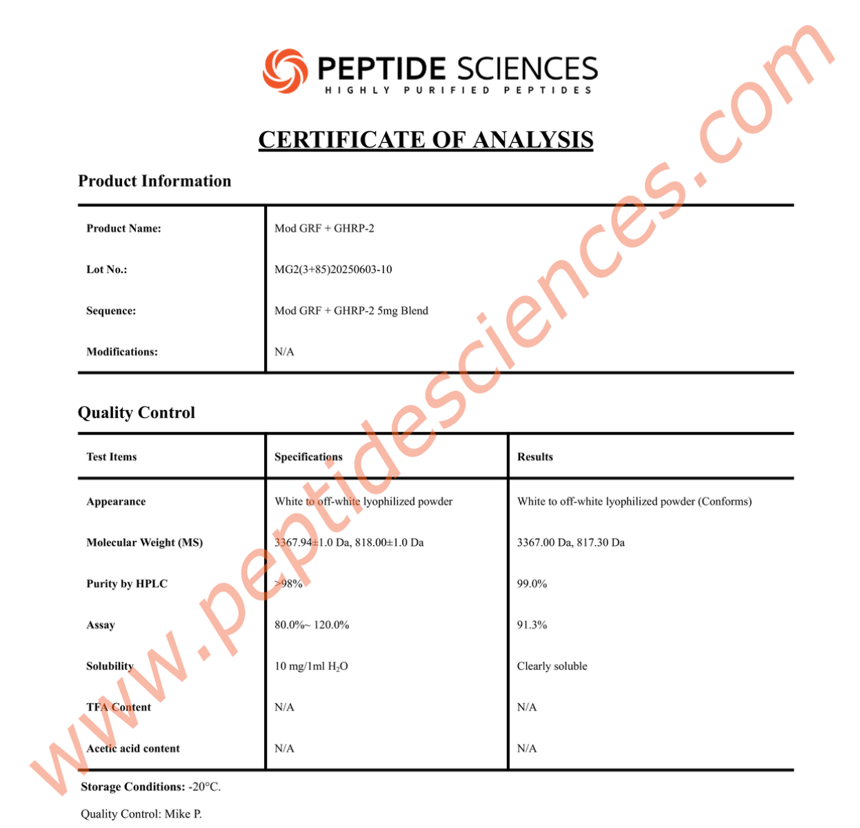Note: The Mod GRF / GHRP-2 Blend is provided for Laboratory Research Use Only. It is not intended for human or animal consumption. Please ensure all safety and handling protocols are strictly followed in your facility.