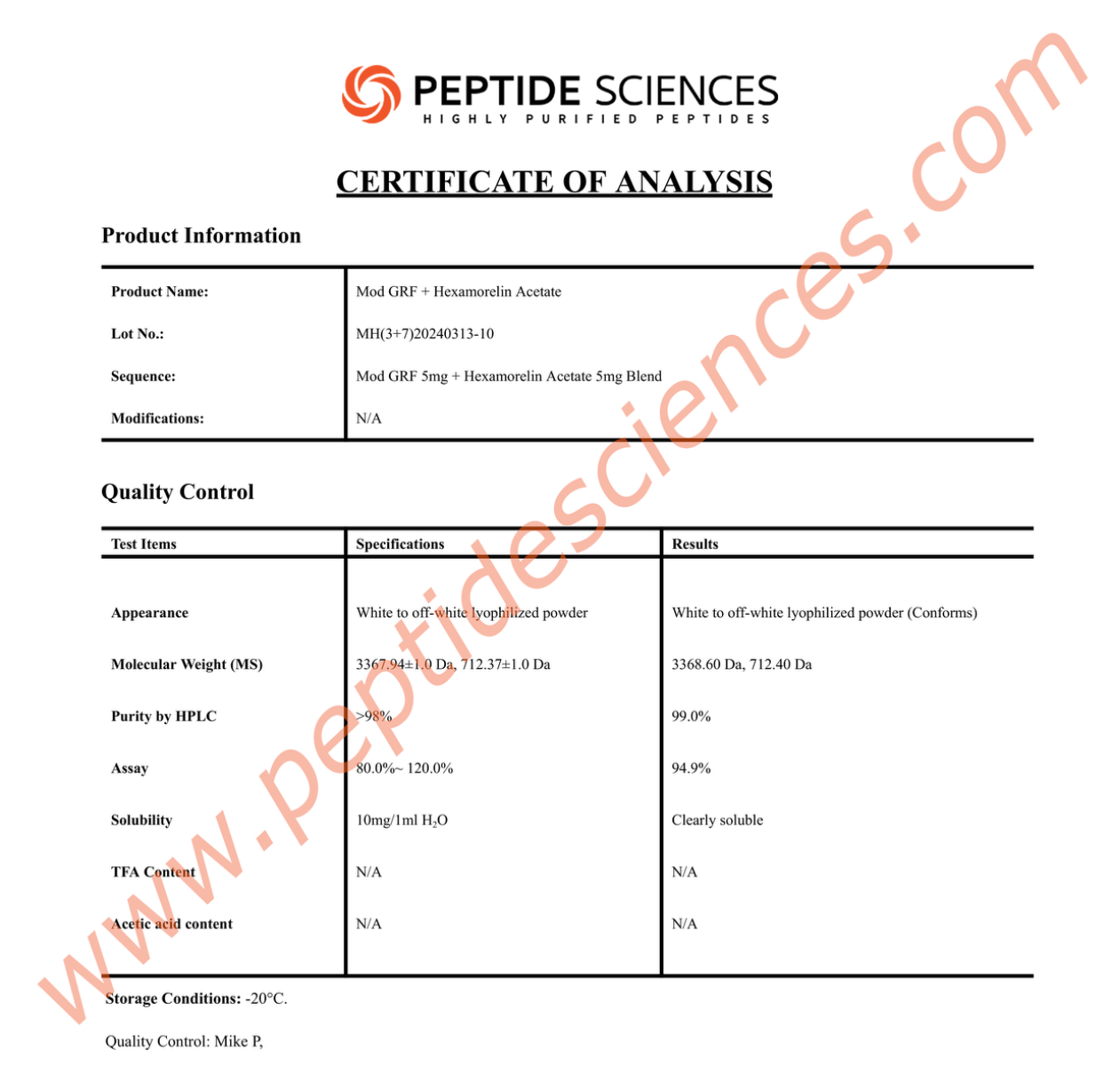 Note: The Mod GRF / Hexarelin Blend is provided for Laboratory Research Use Only. It is not intended for human or animal consumption. Please ensure all safety and handling protocols are strictly followed in your facility.