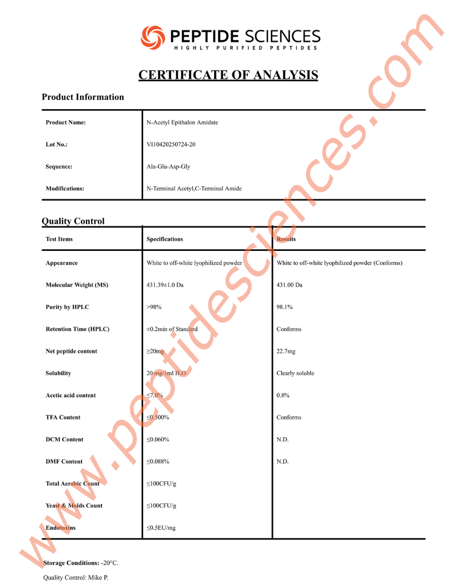 Note: N-Acetyl Epithalon Amidate is provided for Laboratory Research Use Only. It is not intended for human or animal consumption. Please ensure all safety and handling protocols are strictly followed in your facility.